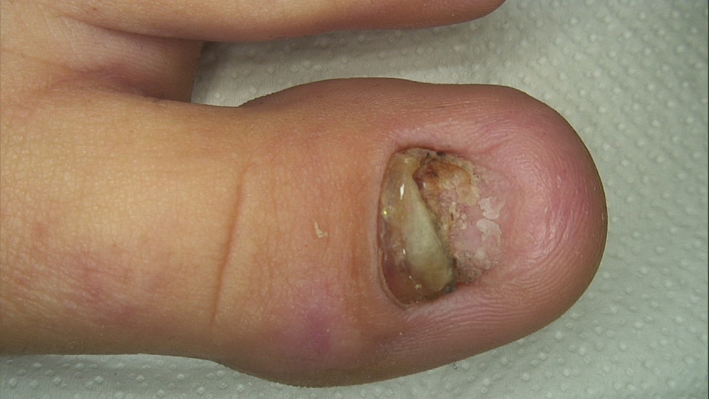 Unatoč prethodnoj terapiji antifungalnim preparatima nije došlo do poboljšanja. Dermatološkim pregledom postavljena je sumnja na retronychiju, poremećaj rasta nokta kod kojeg dolazi do nakupljanja nokatnih ploča i deformacije nokta.
